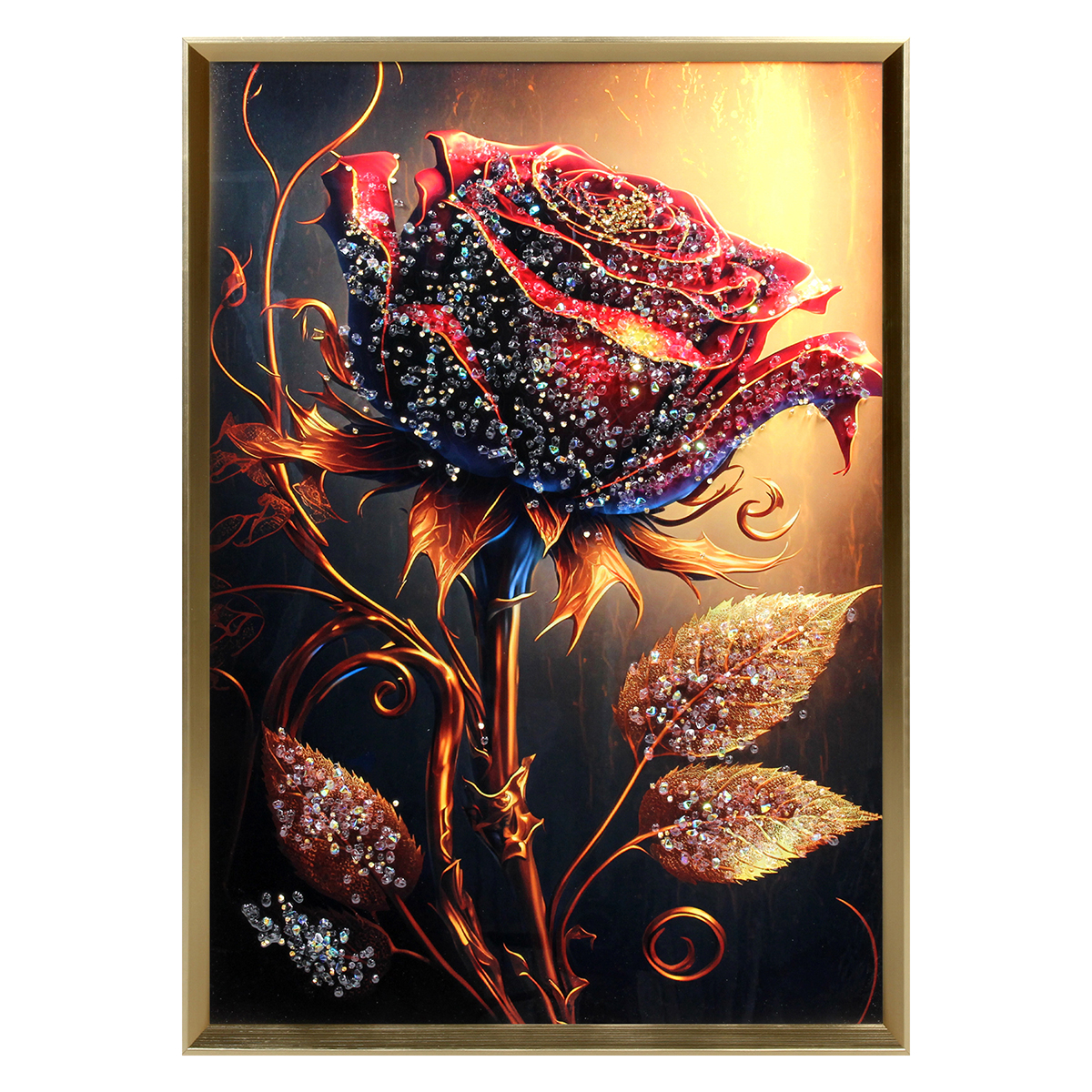 Πίνακας τοίχου ξύλινος 50Χ70 εκ. με χρυσή κορνίζα από PS και ανάγλυφα strass. Αυτός ο πίνακας τοίχου με διαστάσεις 50x70 εκ., διαθέτει χρυσή κορνίζα από PS υλικό. Στο εσωτερικό του πίνακα υπάρχουν ακρυλικά διακοσμητικά, ανάγλυφα strass, τα οποία προσδίδουν έναν λαμπερό και εντυπωσιακό χαρακτήρα στο έργο. Η χρυσή κορνίζα προσθέτει κομψότητα και ανθεκτικότητα, ενώ τα strass στο σχέδιο του πίνακα ενισχύουν την πολυτέλεια της συνολικής αισθητικής. Ιδανικός για χώρους όπου θέλετε να προσθέσετε ένα εκλεπτυσμένο διακοσμητικό στοιχείο.