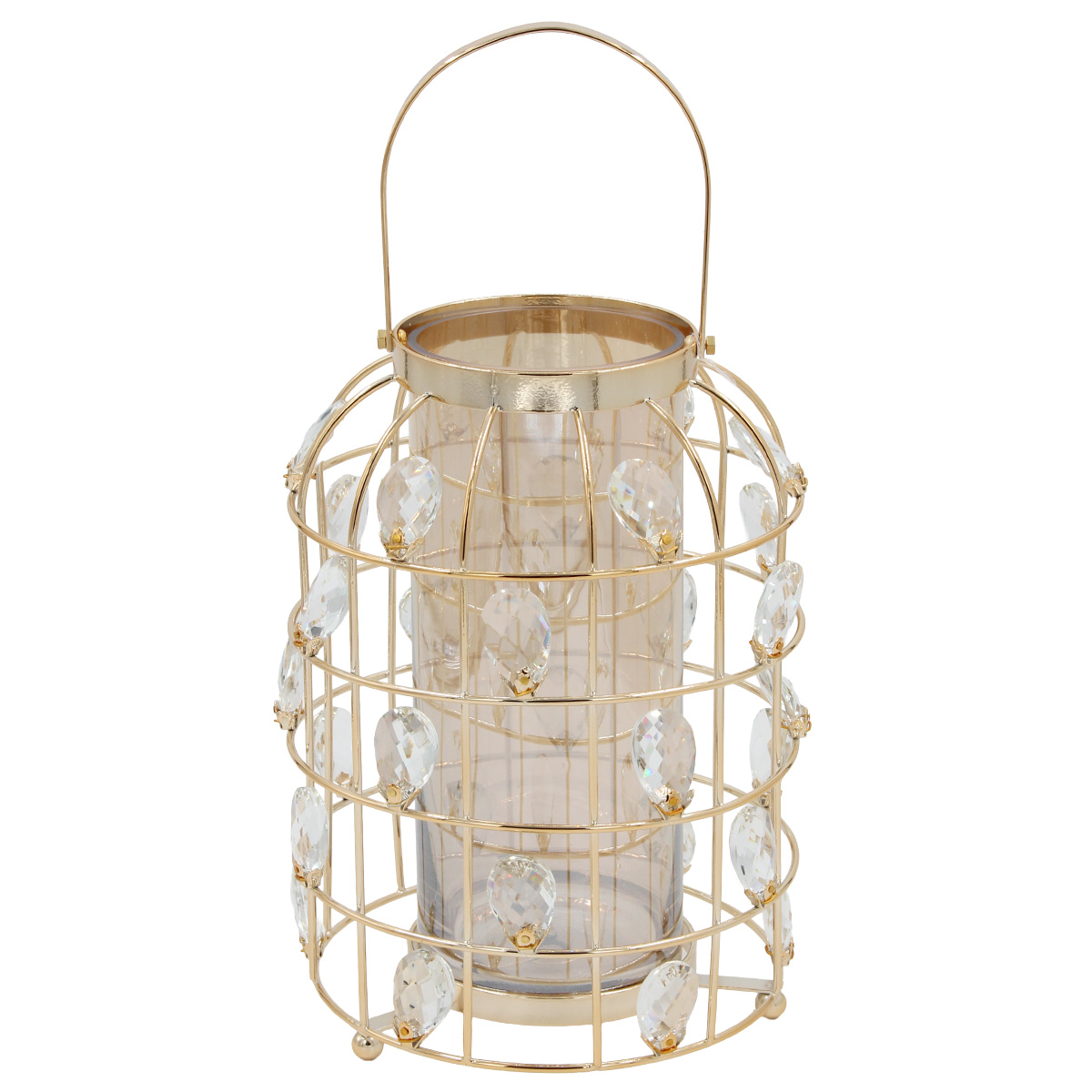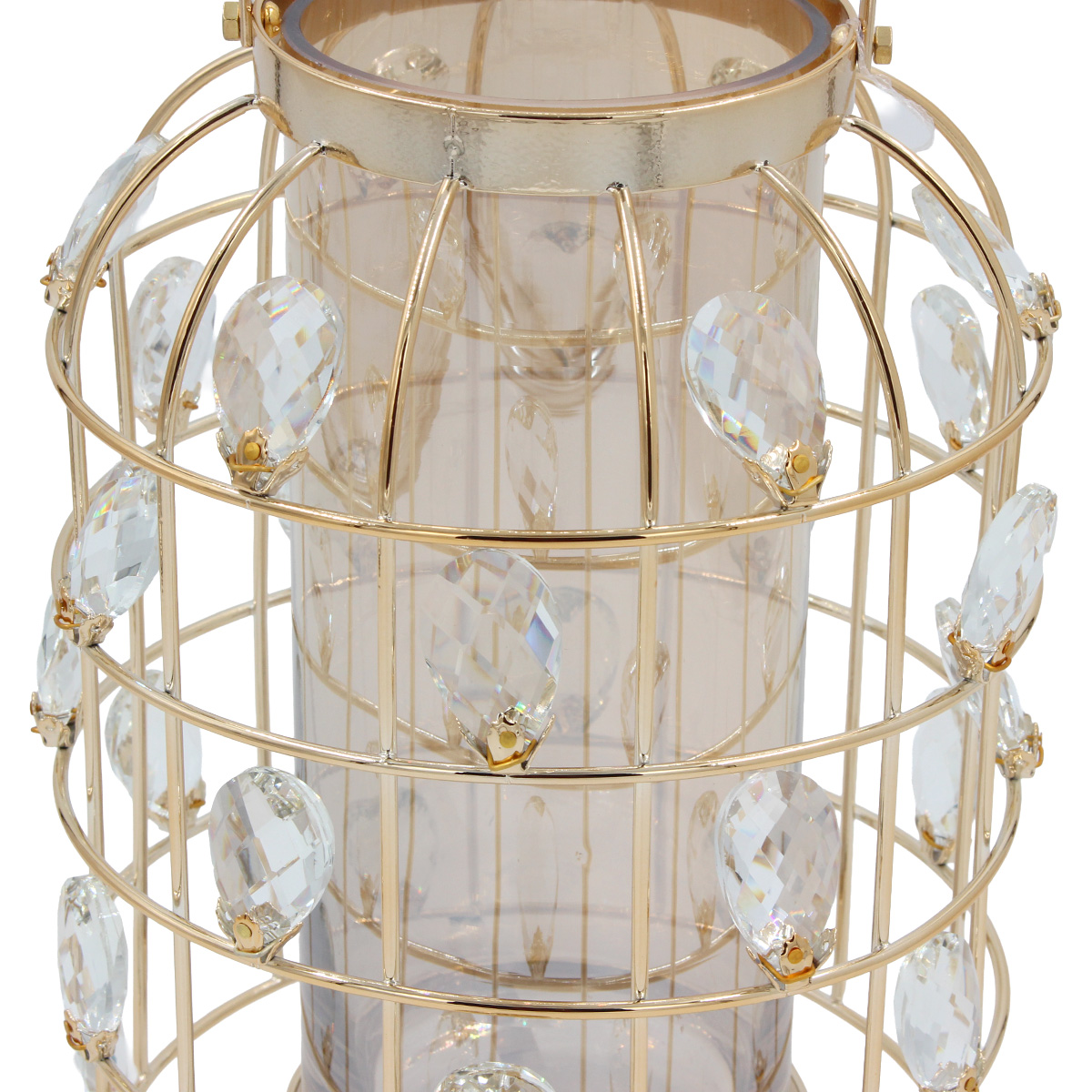 Κηροπήγιο - φανάρι μεταλλικό Φ19Χ26 εκ. Χρυσό με κρύσταλλα και μελί γυαλί - KESKOR 43146
