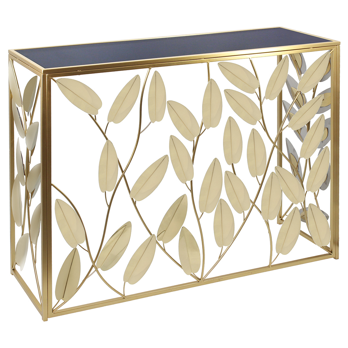 Κονσόλα μεταλλική 100Χ30Χ80 εκ. Χρυσή με φύλλα και Μαύρη γυάλινη επιφάνεια - KESKOR 46008-2