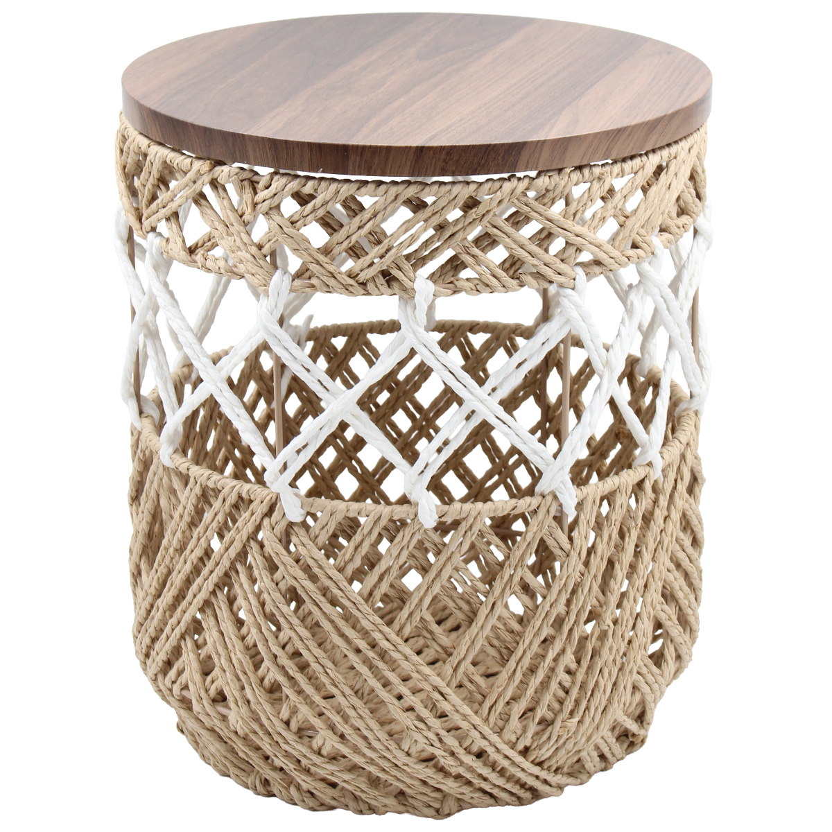 Τραπέζι σαλονιού με πλεκτό σχοινί Φ30Χ36 εκ. Boho και ξύλινη επιφάνεια Αυτό το τραπέζι σαλονιού με πλεκτό σχοινί διαθέτει κομψή ξύλινη επιφάνεια και boho σχεδιασμό. Ιδανικό για να προσθέσει φυσική υφή στον χώρο σας. Συνδυάζει πρακτικότητα και διακοσμητική αισθητική.