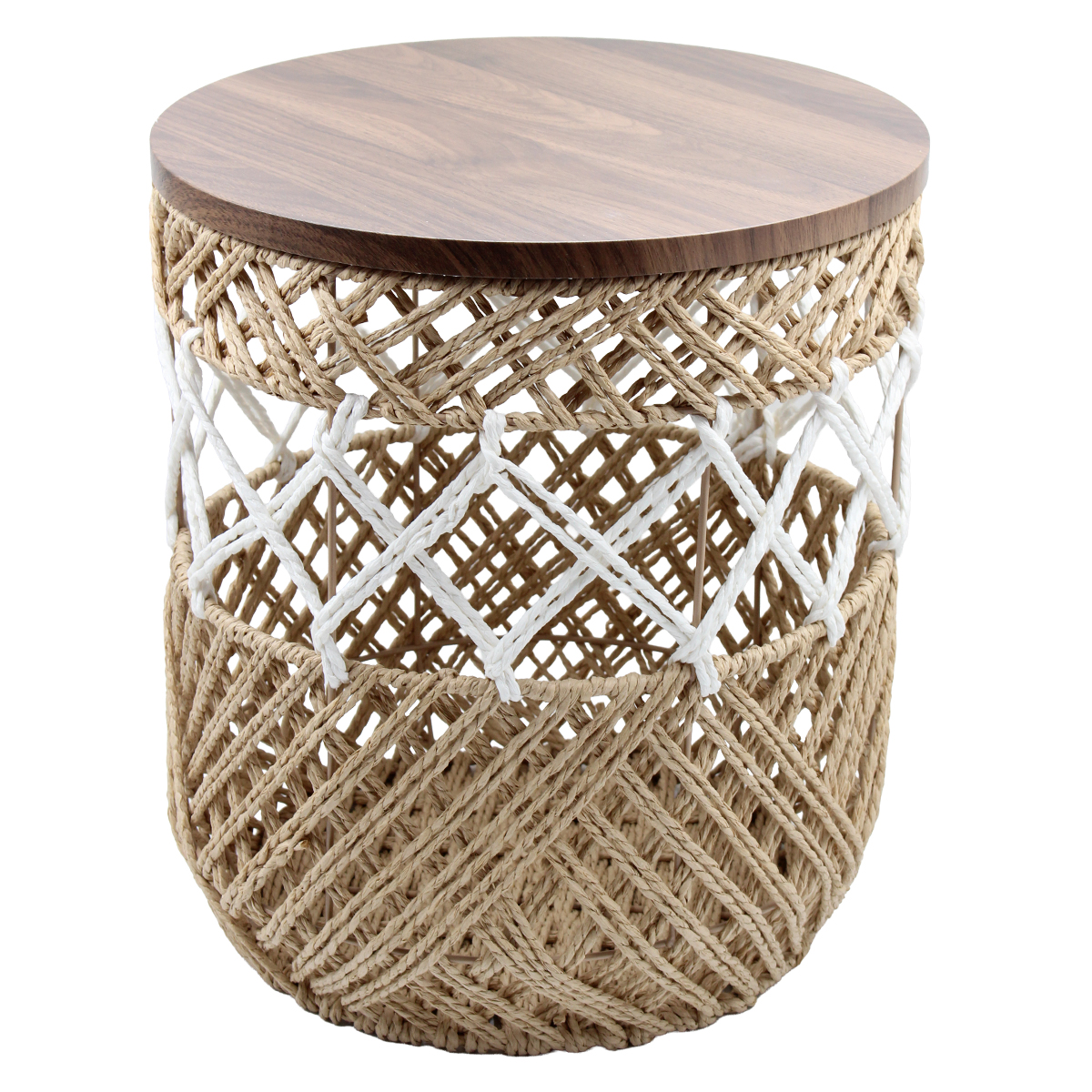 Τραπέζι σαλονιού με πλεκτό σχοινί Φ35Χ40 εκ. Boho και ξύλινη επιφάνεια Αυτό το τραπέζι σαλονιού με πλεκτό σχοινί διαθέτει κομψή ξύλινη επιφάνεια και boho σχεδιασμό. Ιδανικό για να προσθέσει φυσική υφή στον χώρο σας. Συνδυάζει πρακτικότητα και διακοσμητική αισθητική.