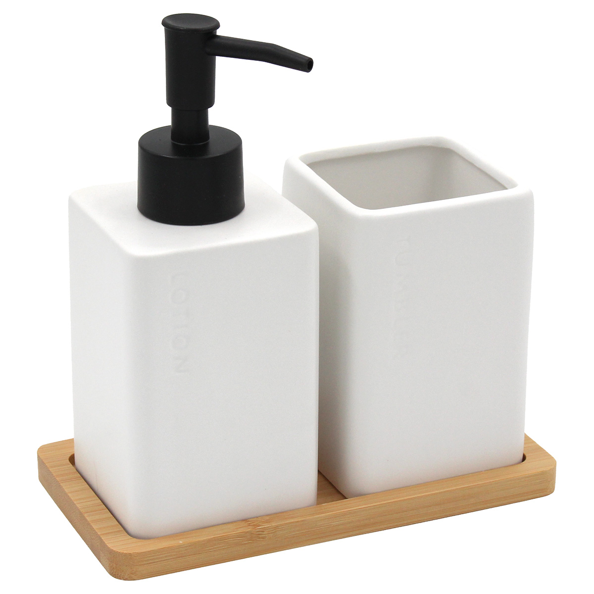 Σετ μπάνιου κεραμικά 2 τεμ. Λευκό με ξύλινη βάση Bamboo Το σετ περιλαμβάνει: