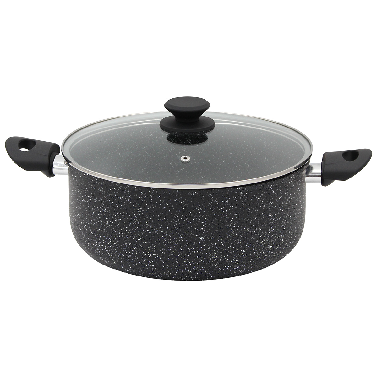 Κατσαρόλα αλουμινίου αντικολλητική με κεραμική επίστρωση πέτρας και πυρίμαχο διάφανο καπάκι Αυτή η κατσαρόλα αλουμινίου με αντικολλητική κεραμική επίστρωση πέτρας προσφέρει υγιεινό μαγείρεμα χωρίς κόλλημα. Διαθέτει ανθεκτικό διάφανο πυρίμαχο καπάκι, ιδανικό για καθημερινή χρήση και εύκολη παρακολούθηση του μαγειρέματος.