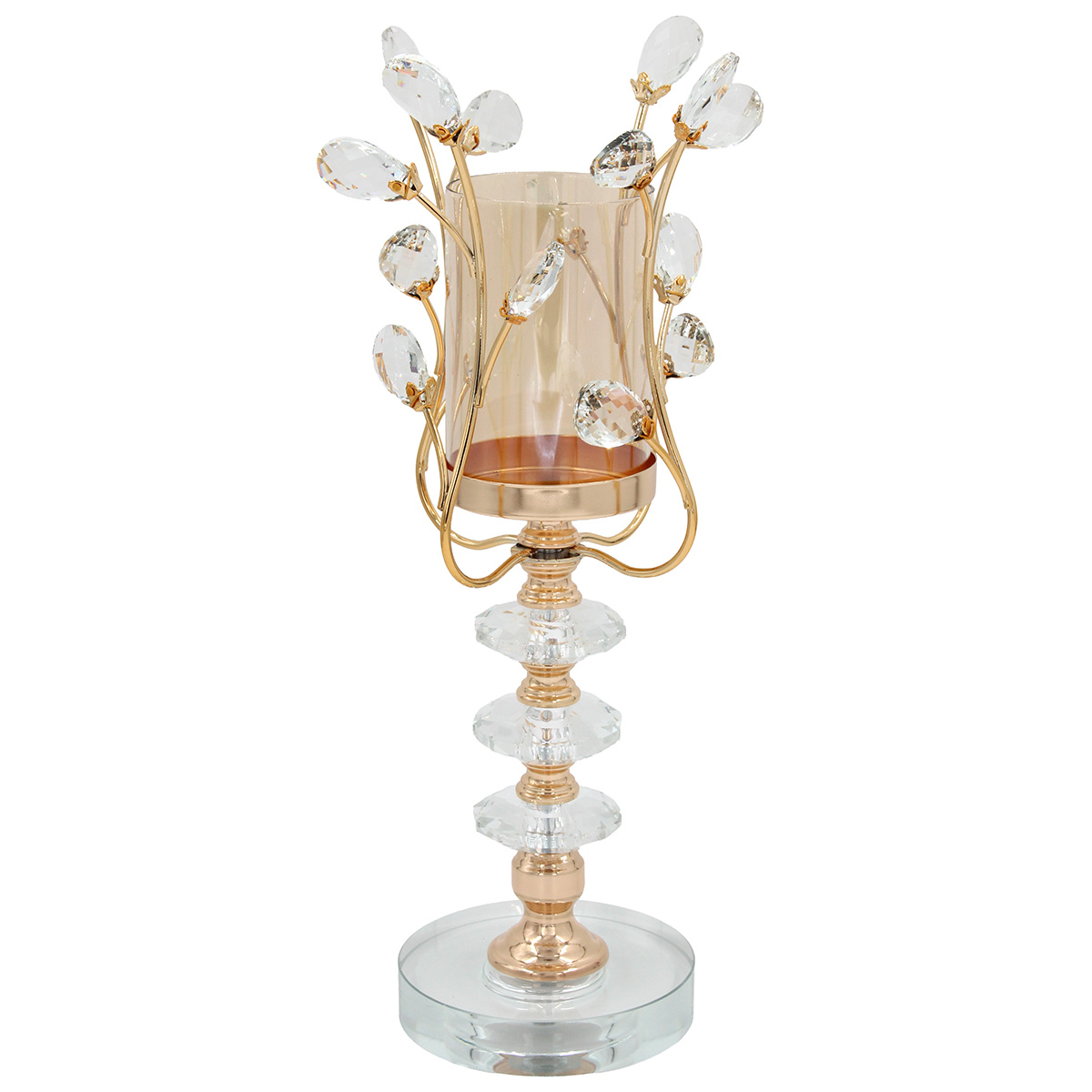 Κηροπήγιο μεταλλικό Φ12Χ39 εκ. Χρυσό με κρύσταλλα και μελί γυαλί