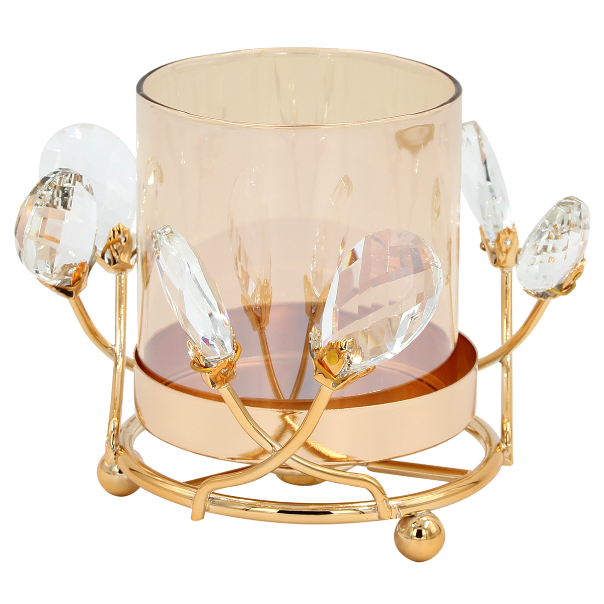 Κηροπήγιο μεταλλικό με διάμετρο Φ13 και ύψος 10 εκ. σε χρυσό χρώμα. Διαθέτει κρύσταλλα και μελί γυαλί για ζεστή ατμόσφαιρα.