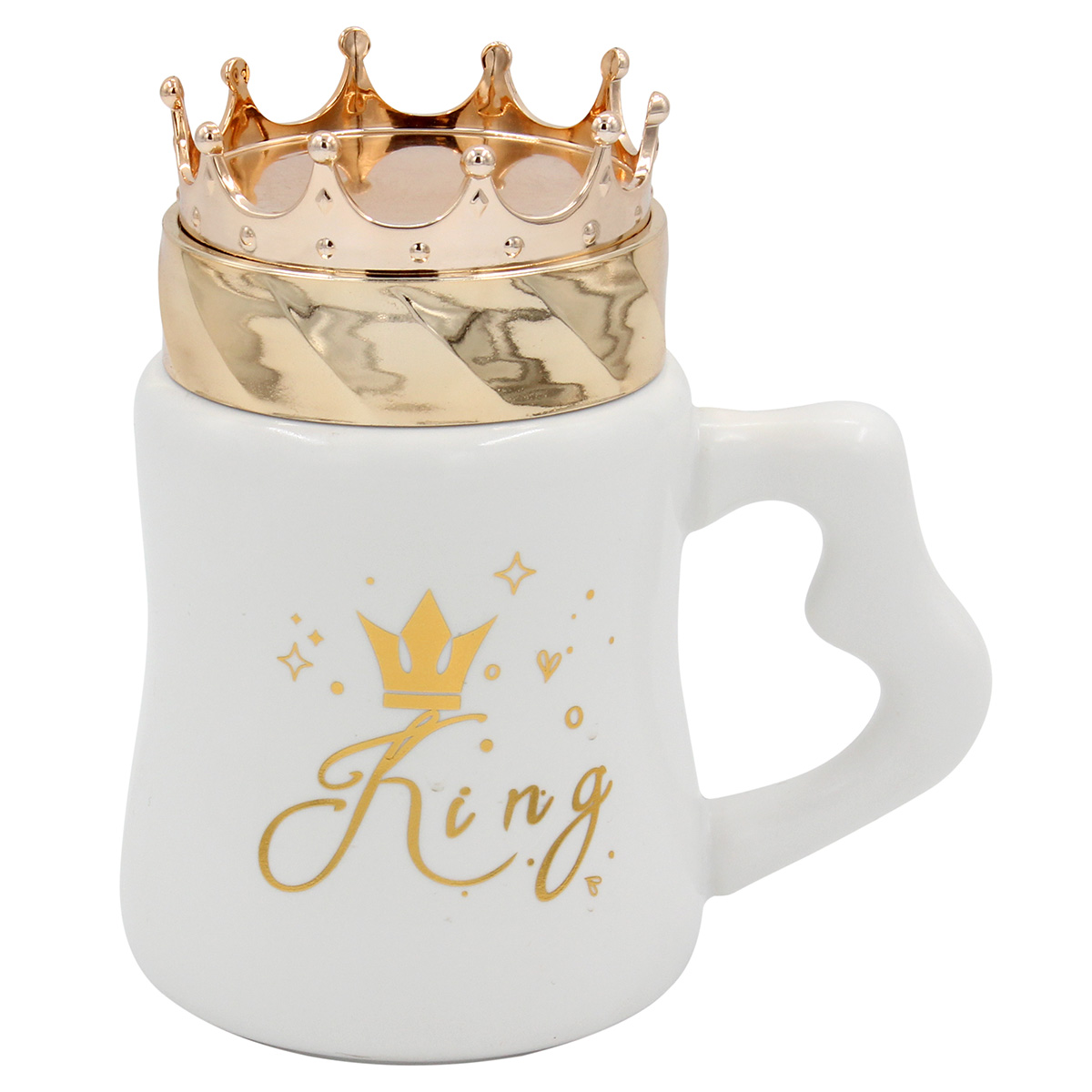 Αυτή η κούπα κεραμική 400 ml σε λευκό και χρυσό είναι εξοπλισμένη με χρυσό πλαστικό καπάκι KING. Οι διαστάσεις της είναι Φ9Χ14 εκ., ιδανικές για καθημερινή χρήση. Μοντέρνα, κομψή και ανθεκτική.