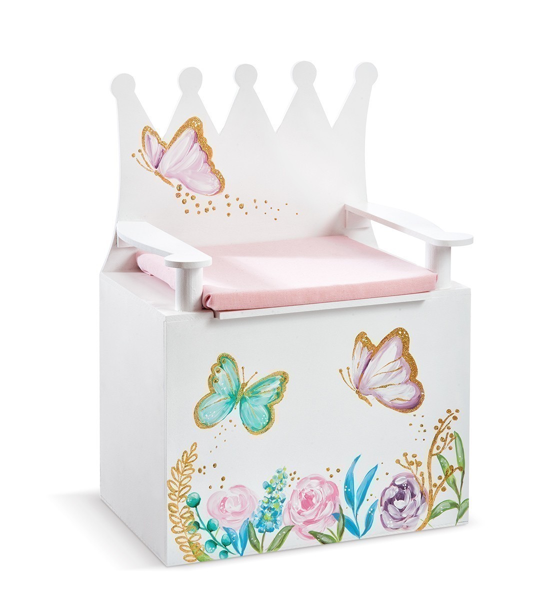 Ξύλινο λευκό κουτί βαπτιστικών καθισματάκι σε σχήμα θρόνου. Στο κάθισμα είναι τοποθετημένο μαξιλάρι ντυμένο με βαμβακερό ύφασμα. Το μπροστινό κομμάτι είναι ζωγραφισμένο με πολύχρωμα λουλούδια και πεταλούδες. Η πλάτη στο καθισματάκι έχει το σχήμα κορώνας και είναι ζωγραφισμένη με πεταλούδα.