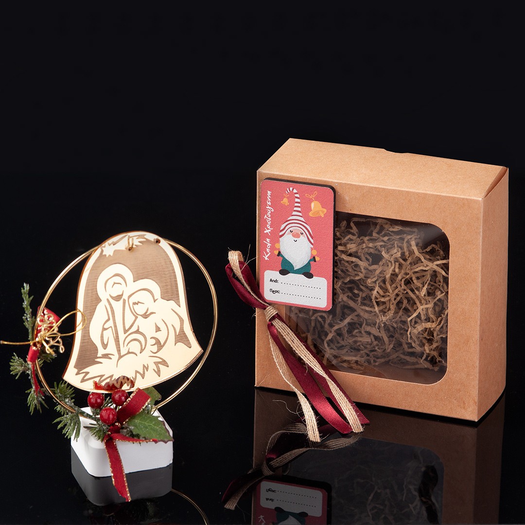 Χριστουγεννιάτικο διακοσμητικό σε γύψινη βάση με plexiglass χρυσή καμπάνα με χαραγμένη την φάτνη. Η βάση είναι στολισμένη με γκι. Στην τιμή περιλαμβάνεται το κουτάκι δώρου που είναι τοποθετημένο το γούρι.