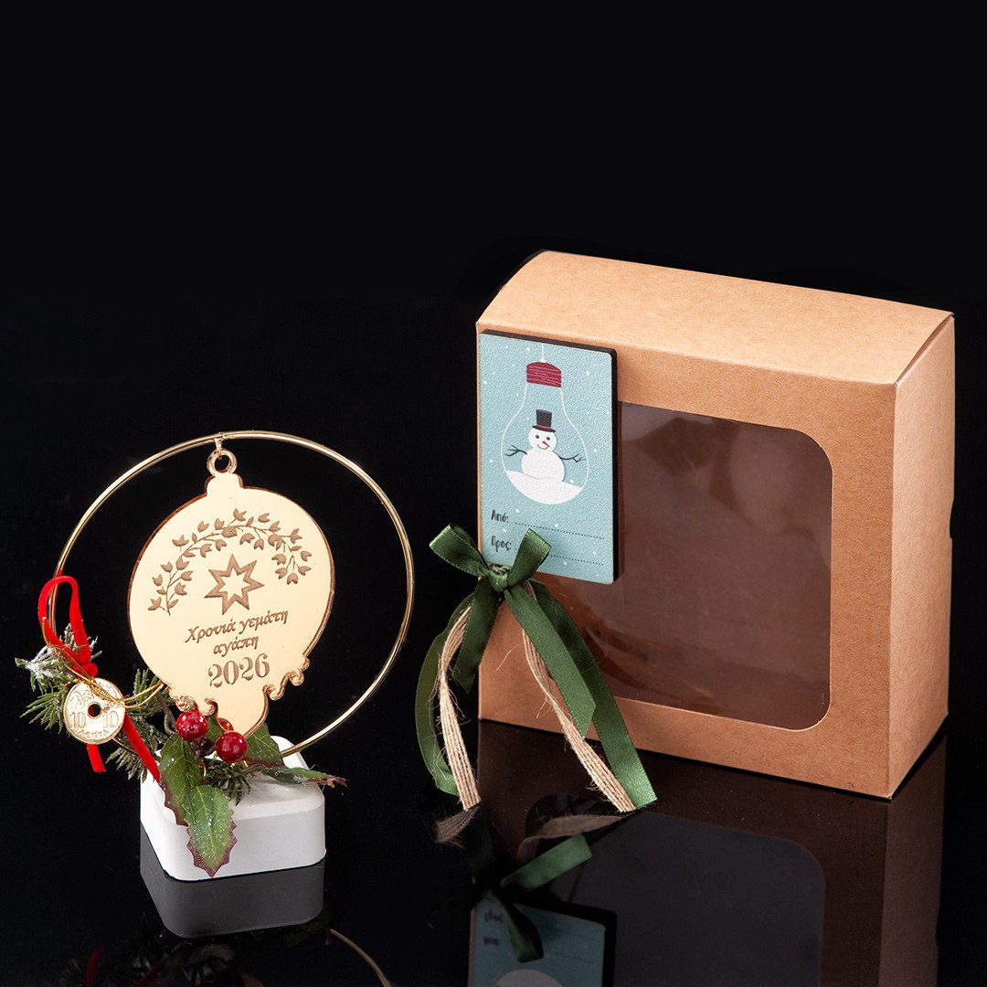 Χριστουγεννιάτικο διακοσμητικό σε γύψινη βάση με plexiglass χρυσό καθρέπτη στολίδι με ευχές. Η βάση είναι στολισμένη με γκι και μεταλλικό μοτίφ. Στην τιμή περιλαμβάνεται το χάρτινο κουτί δώρου που είναι τοποθετημένο το γούρι και η ετικέτα αποστολής.