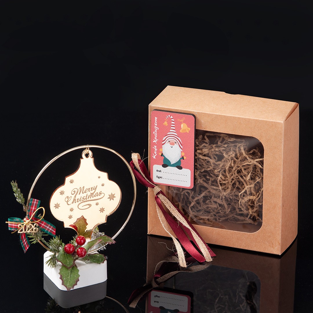 Χριστουγεννιάτικο διακοσμητικό σε γύψινη βάση με plexiglass χρυσό καθρέπτη στολίδι με χαραγμένη ευχή . Η βάση είναι στολισμένη με γκι και καρώ κορδέλα. Στην τιμή περιλαμβάνεται το χάρτινο κουτί δώρου που είναι τοποθετημένο το γούρι και η ετικέτα αποστολής.