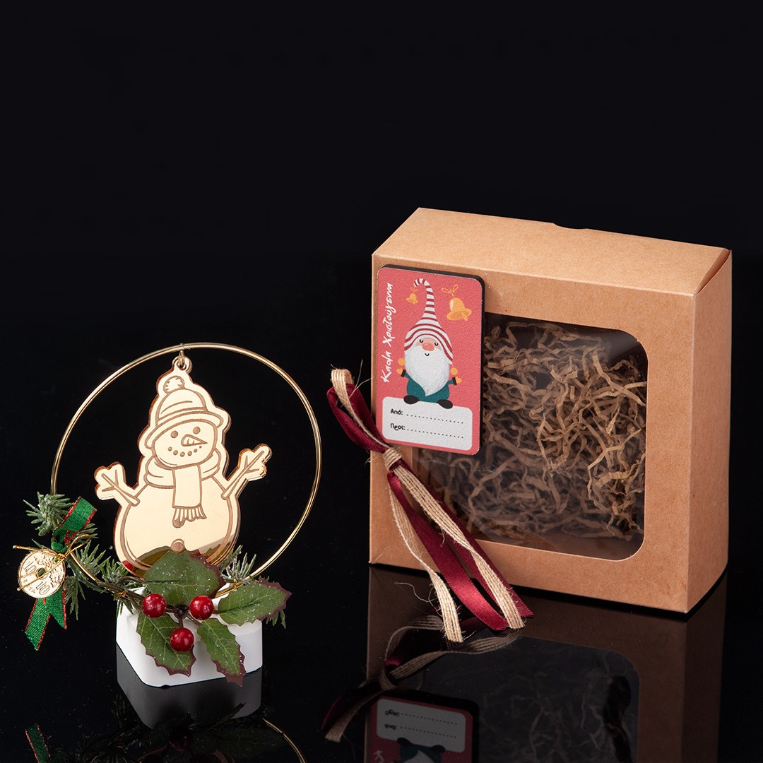 Χριστουγεννιάτικο διακοσμητικό σε γύψινη βάση με plexiglass χρυσό καθρέπτη χιονάνθρωπο. Η βάση είναι στολισμένη με γκι και μεταλλικό μοτίφ. Στην τιμή περιλαμβάνεται το χάρτινο κουτί δώρου που είναι τοποθετημένο το γούρι και η ετικέτα αποστολής.