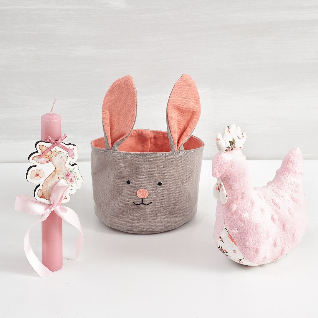 υφασμάτινο επιτραπέζιο καλαθάκι με σχέδιο λαγουδάκι και λούτρινη ροζ κοτούλα.