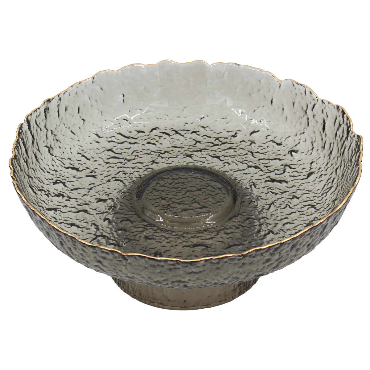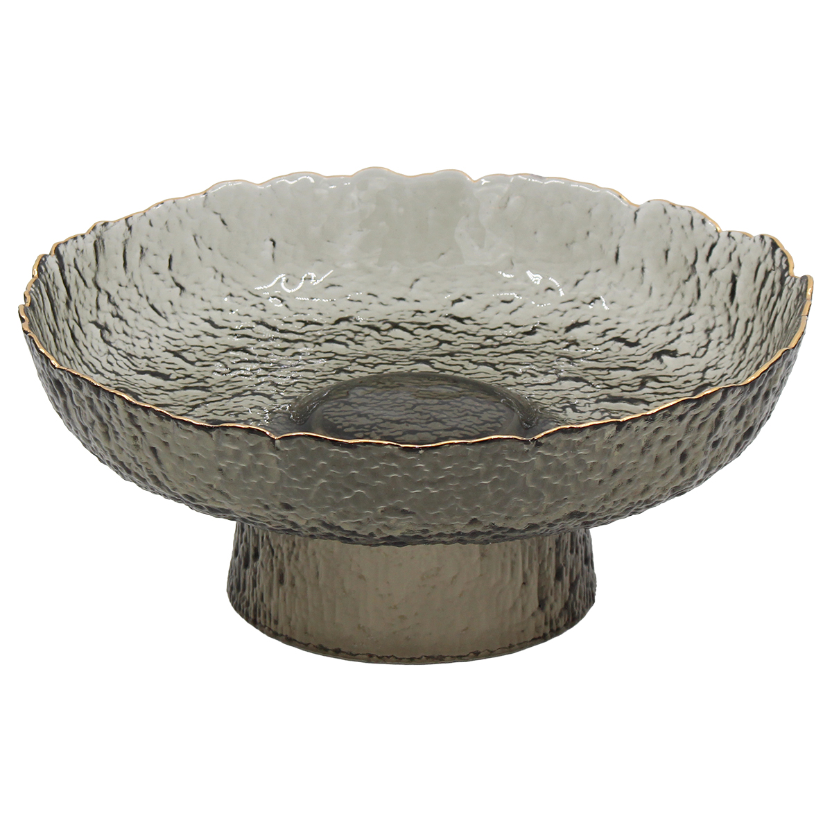Αυτή η γυάλινη κολωνάτη πιατέλα (Φ26Χ11 εκ.) σε μαύρο φιμέ χρώμα με χρυσό χείλος δημιουργεί κομψή ατμόσφαιρα σε κάθε διακόσμηση.