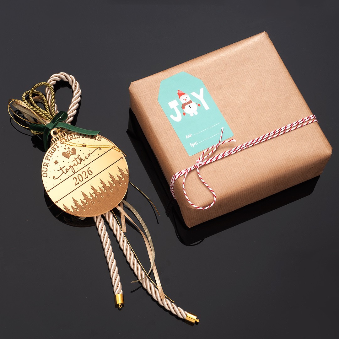 Χριστουγεννιάτικο κρεμαστό γούρι με χρυσό καθρέπτη plexiglass στολίδι με ευχές για ζευγάρι και στολισμένο με εκρού και πράσινο κορδόνι rayon .Το γούρι είναι τοποθετημένο σε χάρτινο κουτί craft,συσκευασμένο με χαρτί περιτυλίγματος και αυτοκόλλητη ετικέτα αποστολής.