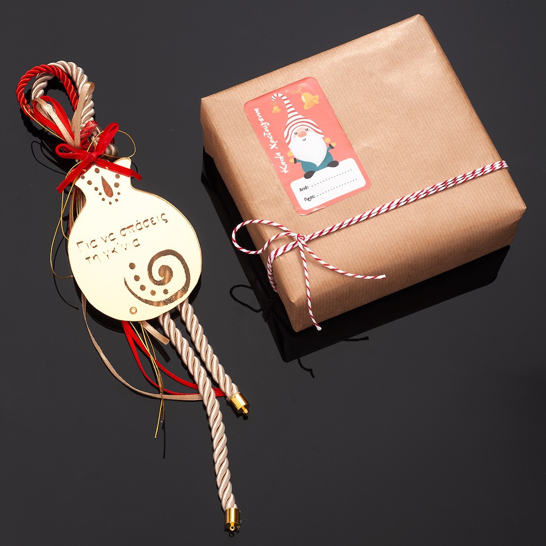 Χριστουγεννιάτικο κρεμαστό γούρι με χρυσό καθρέπτη plexiglass ρόδι με ευχές και στολισμένο με κορδόνι rayon σε κόκκινη και εκρού απόχρωση .Το γούρι είναι τοποθετημένο σε χάρτινο κουτί craft,συσκευασμένο με χαρτί περιτυλίγματος και αυτοκόλλητη ετικέτα αποστολής.