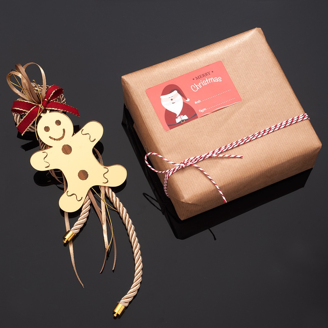 Χριστουγεννιάτικο κρεμαστό γούρι με χρυσό καθρέπτη plexiglass gingerbread και στολισμένο με εκρού κορδόνι rayon. Το γούρι είναι τοποθετημένο σε χάρτινο κουτί craft,συσκευασμένο με χαρτί περιτυλίγματος και αυτοκόλλητη ετικέτα αποστολής.