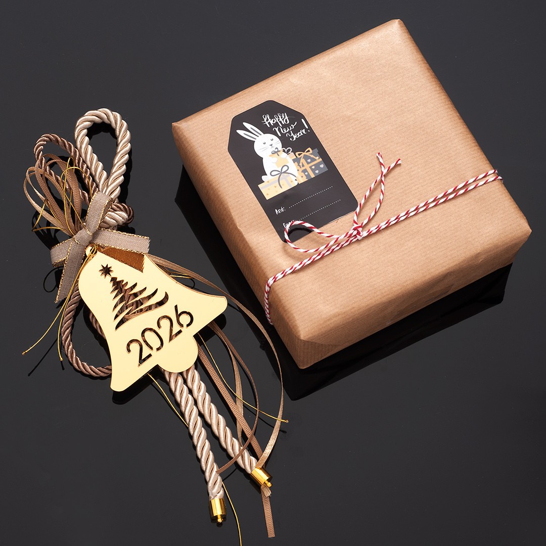 Χριστουγεννιάτικο κρεμαστό γούρι με χρυσό καθρέπτη plexiglass καμπανούλα και στολισμένο με κορδόνι rayon και κορδέλες σε εκρού αποχρώσεις . Το γούρι είναι τοποθετημένο σε χάρτινο κουτί craft,συσκευασμένο με χαρτί περιτυλίγματος και αυτοκόλλητη ετικέτα αποστολής.