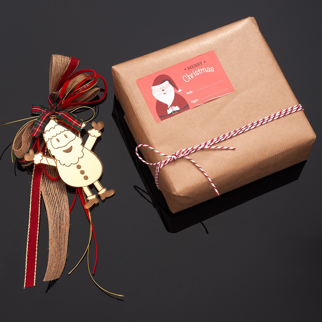 Χριστουγεννιάτικο κρεμαστό γούρι με χρυσό καθρέπτη plexiglass Αϊ-Βασίλη και στολισμένο με κορδέλα καρώ και γιούτα. Το γούρι είναι τοποθετημένο σε χάρτινο κουτί craft,συσκευασμένο με χαρτί περιτυλίγματος και αυτοκόλλητη ετικέτα αποστολής.