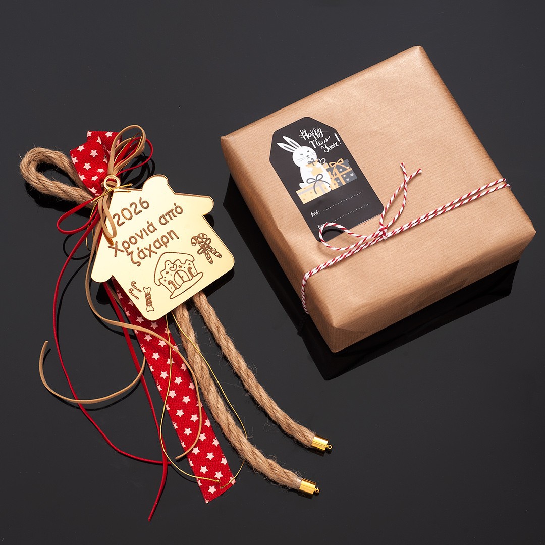 Χριστουγεννιάτικο κρεμαστό γούρι με χρυσό καθρέπτη plexiglass σπιτάκι με ευχές και στολισμένο με κορδόνι γιούτα και κόκκινη κορδέλα με αστέρια. Το γούρι είναι τοποθετημένο σε χάρτινο κουτί craft,συσκευασμένο με χαρτί περιτυλίγματος και αυτοκόλλητη ετικέτα αποστολής.