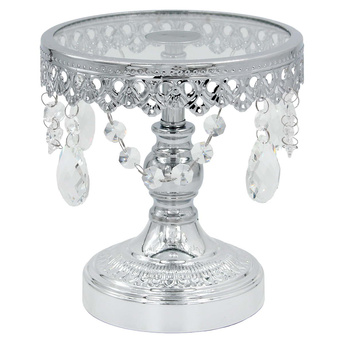 Τουρτιέρα – πιατέλα κολωνάτη μεταλλική Φ18Χ20 εκ. Ασημί με κρύσταλλα και γυάλινη επιφάνεια - KESKOR 43115-3