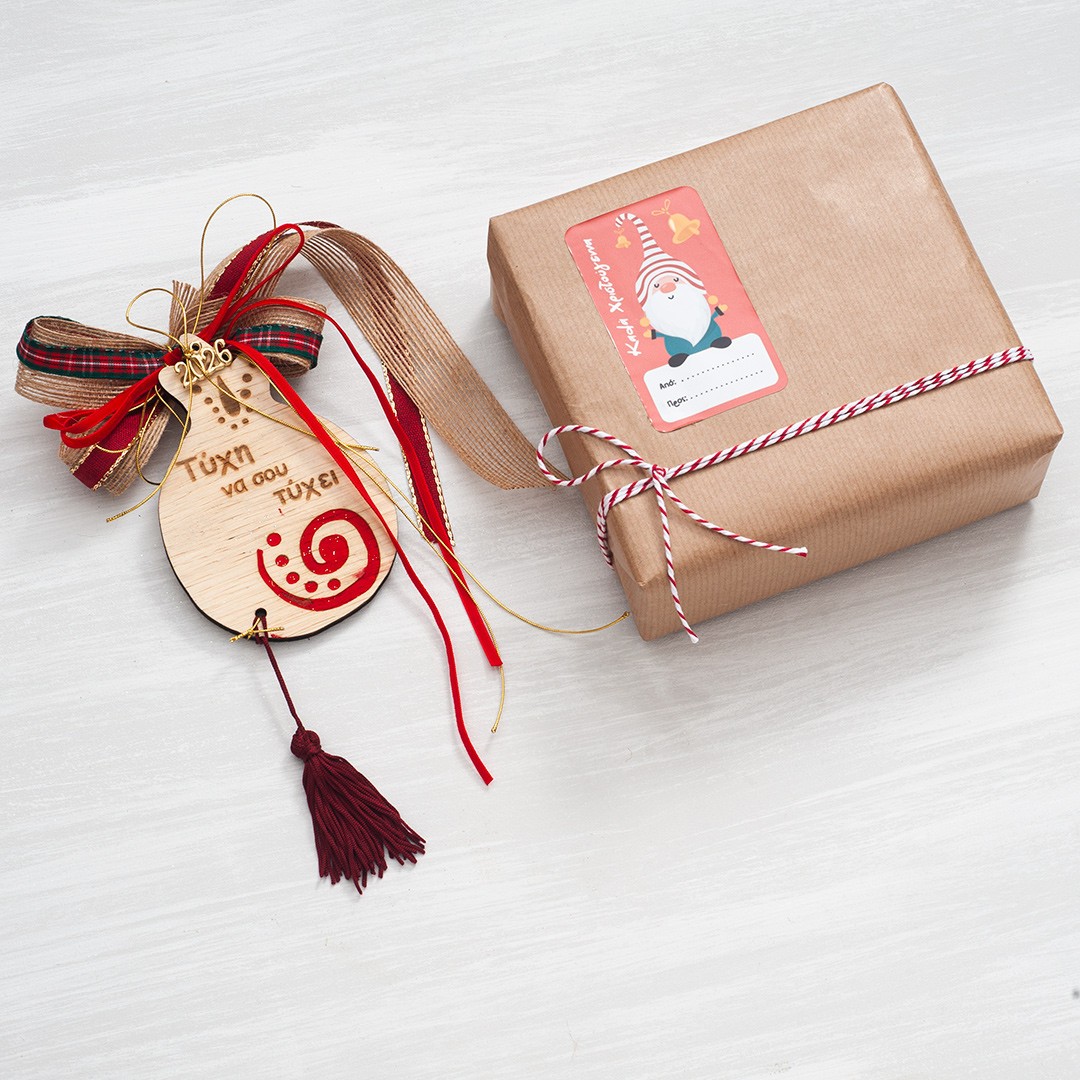 Χριστουγεννιάτικο κρεμαστό γούρι με ξύλινο ρόδι με ευχές και στολισμένο με κορδέλες σε κόκκινες αποχρώσεις. Το γούρι είναι τοποθετημένο σε χάρτινο κουτί craft,συσκευασμένο με χαρτί περιτυλίγματος και αυτοκόλλητη ετικέτα αποστολής.
