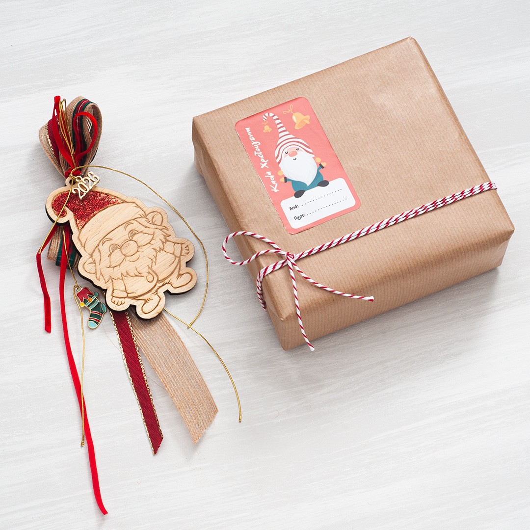 Χριστουγεννιάτικο κρεμαστό γούρι με ξύλινο Αϊ-Βασίλη με glitter σκουφάκι και στολισμένο με κορδέλες σε κόκκινες αποχρώσεις. Το γούρι είναι τοποθετημένο σε χάρτινο κουτί craft,συσκευασμένο με χαρτί περιτυλίγματος και αυτοκόλλητη ετικέτα αποστολής.