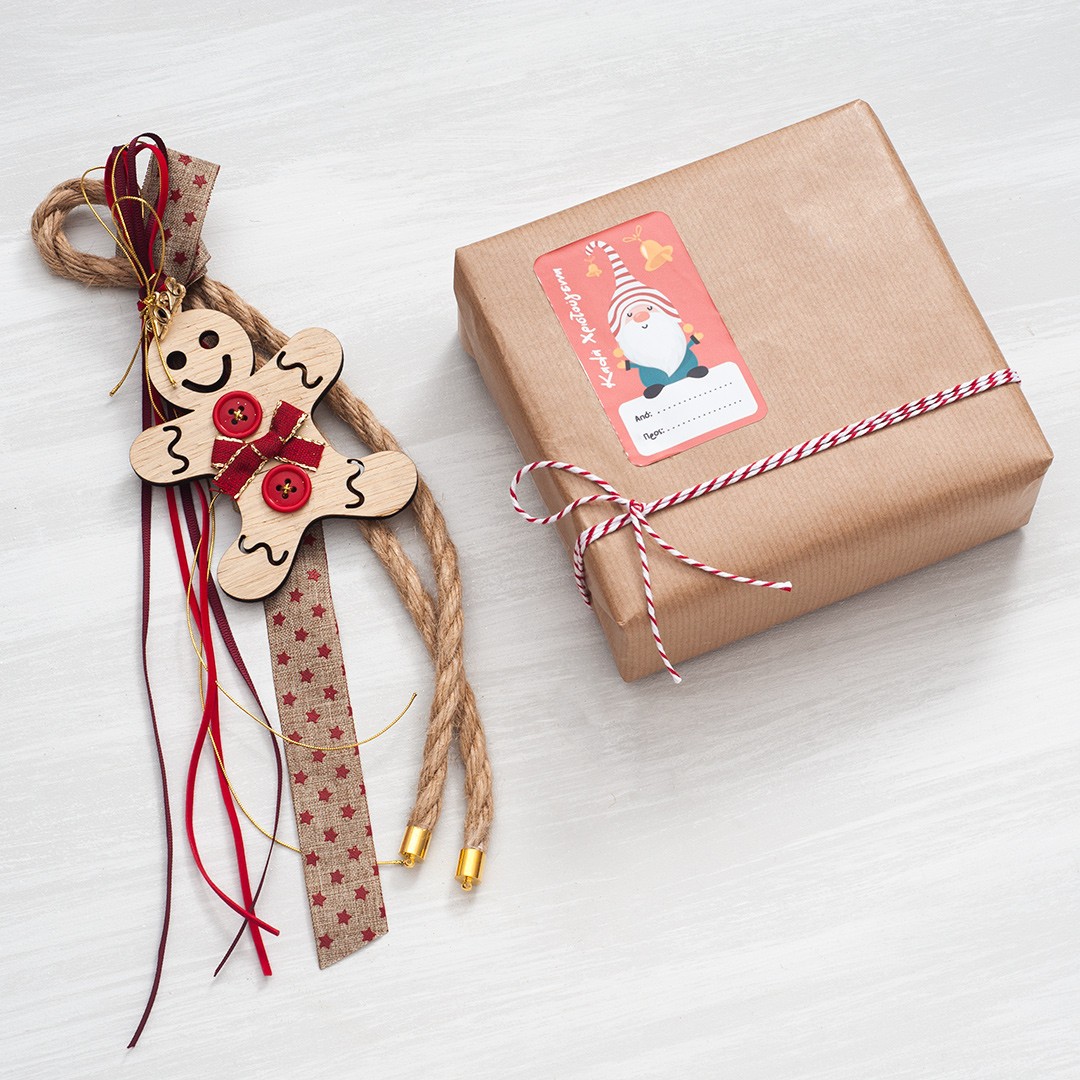 Χριστουγεννιάτικο κρεμαστό γούρι με ξύλινο μπισκοτούλη και στολισμένο με κορδέλες σε κόκκινες αποχρώσεις. Το γούρι είναι τοποθετημένο σε χάρτινο κουτί craft,συσκευασμένο με χαρτί περιτυλίγματος και αυτοκόλλητη ετικέτα αποστολής.