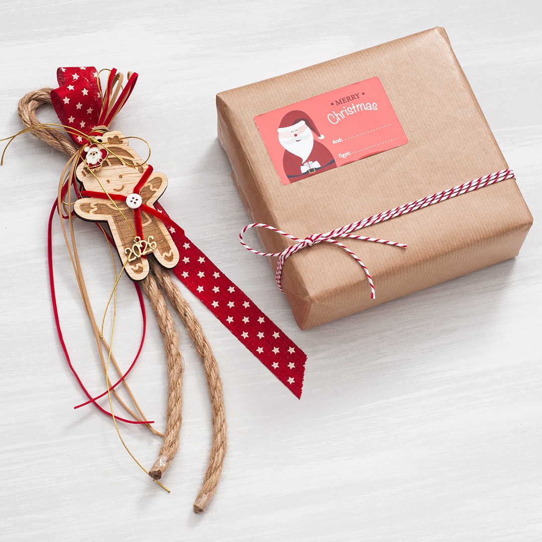 Χριστουγεννιάτικο κρεμαστό γούρι με ξύλινο αγοράκι και στολισμένο με κορδόνι γιούτα και κορδέλες σε κόκκινες αποχρώσεις .Το γούρι είναι τοποθετημένο σε χάρτινο κουτί craft,συσκευασμένο με χαρτί περιτυλίγματος και αυτοκόλλητη ετικέτα αποστολής.